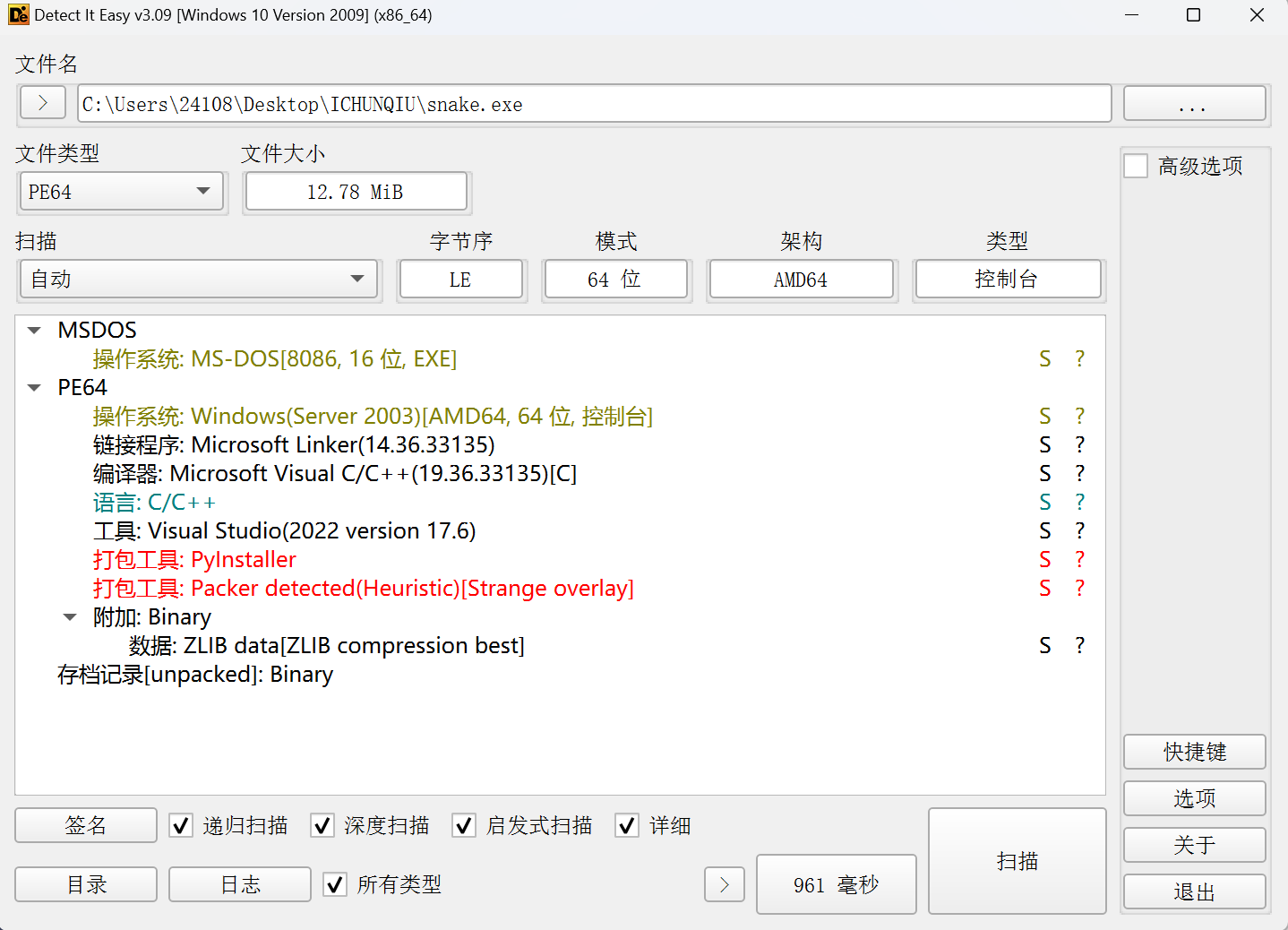 使用DIE工具检查可以得知该小游戏是用Py写的,且使用了PyInstaller打包